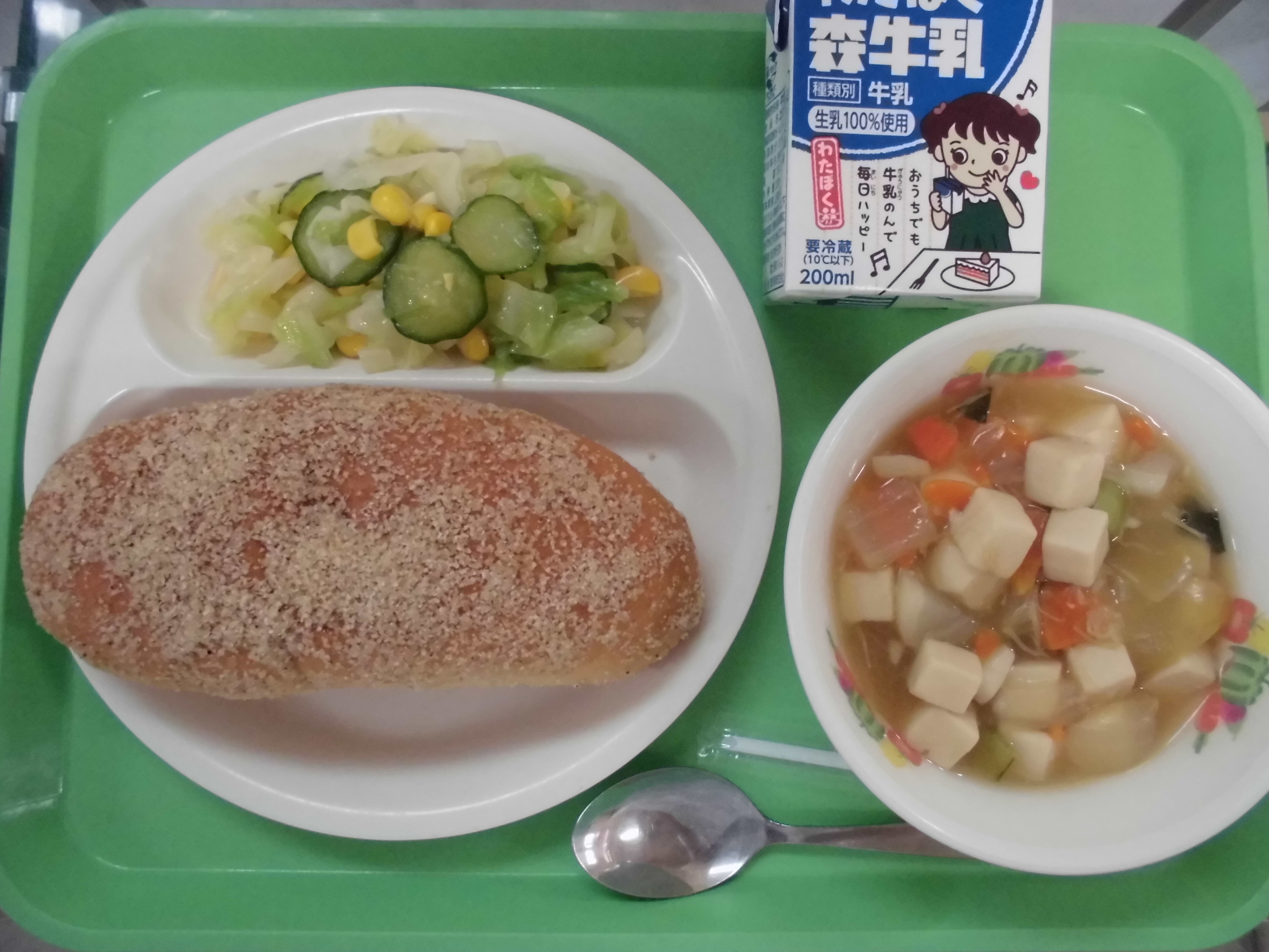 ★「揚げパン」は今も昔も人気の献立ですね。今日は、すりごまたっぷりのごま揚げパンにしました。いつもの揚げパンより甘みは控えめですが、香ばしくて、ペロッと食べられる揚げパンです。次は何味の揚げパンにしようか…お楽しみに!