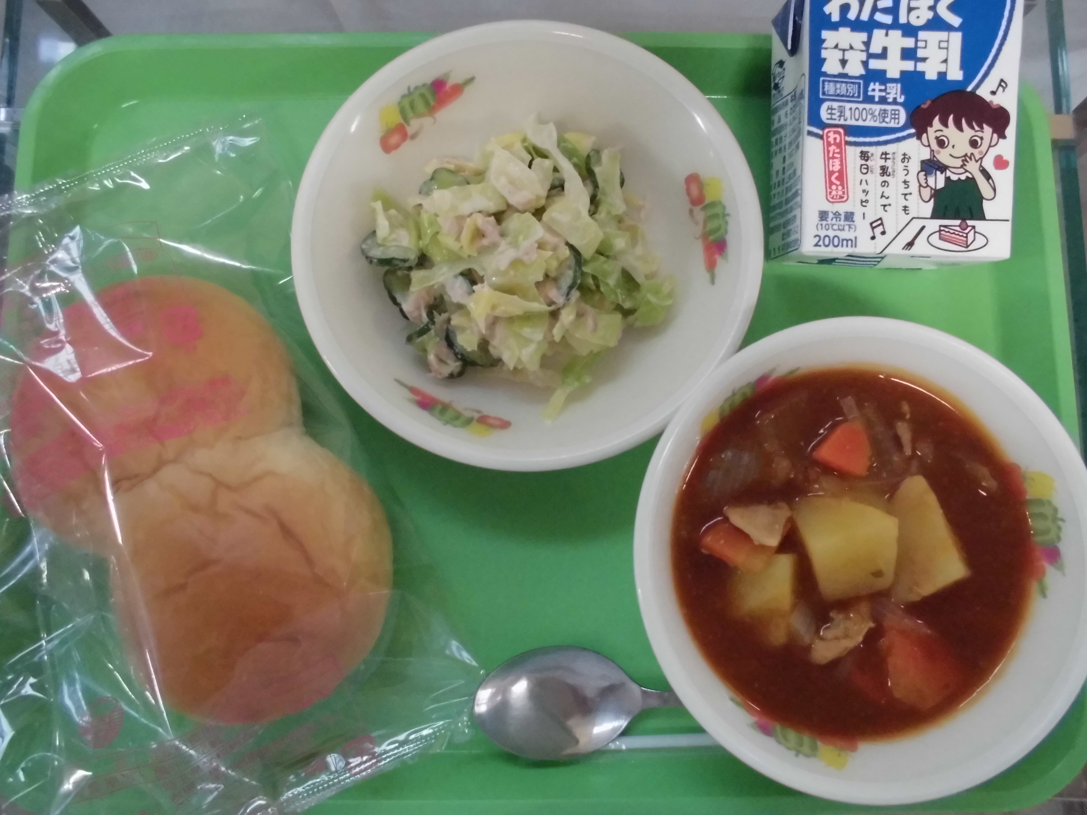★給食では、ホワイトシチューを作ることが多いのですが、今日は、ホワイトシチューに負けないくらい体が温まるブラウンシチューにしました。デミグラスソースがたっぷり入っているので、コクがあって、野菜が苦手な子も食べやすい味付けです。残りはほとんどありませんでした!