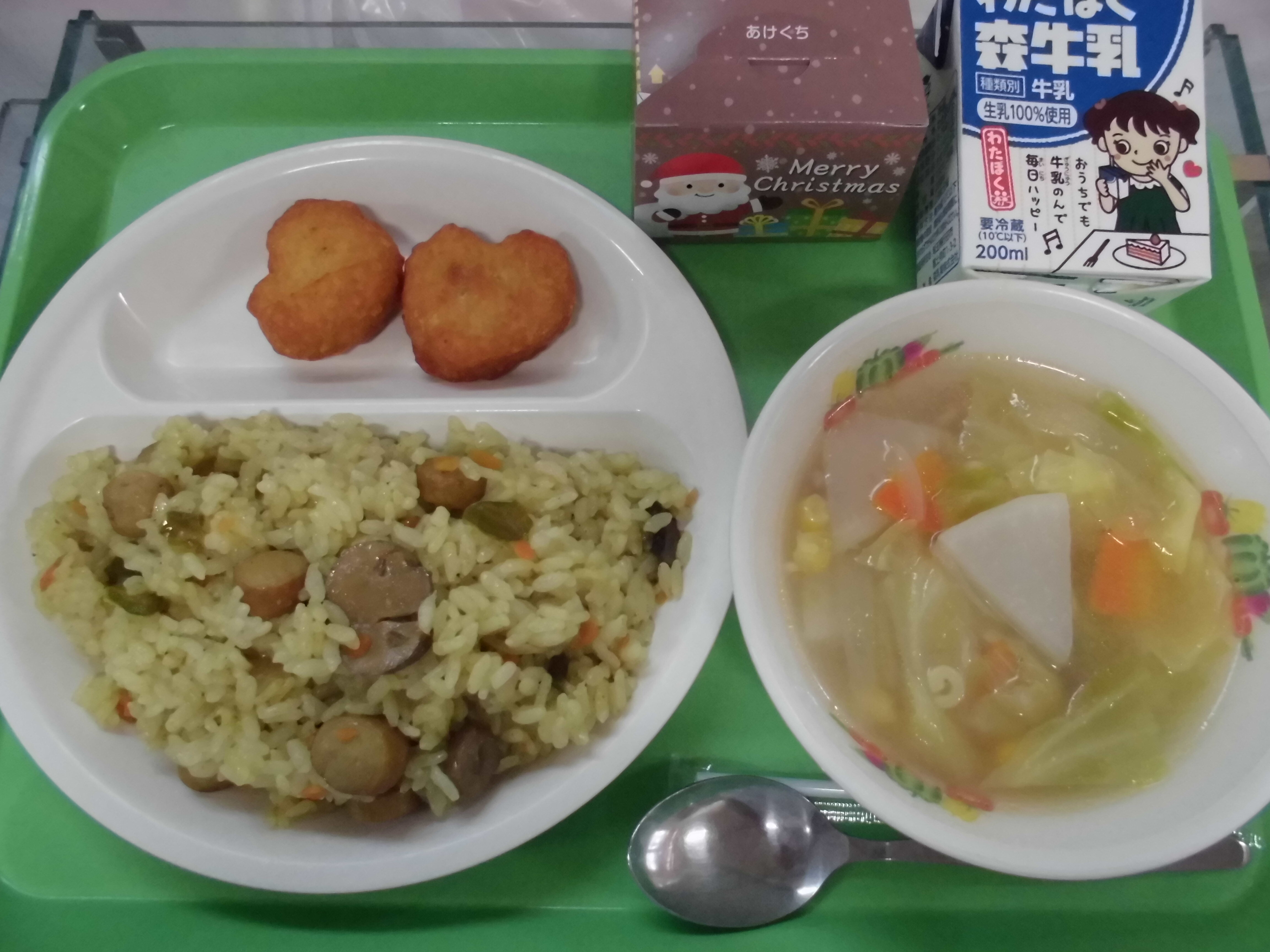 ★2学期最後の給食となりました。最後の給食は「クリスマス献立」です。クリスマスケーキを2種類の味から自分で選んでもらいました。「もっと大きいケーキかと思った…」なんていう声も聞こえてきましたが、余ったケーキの大じゃんけん大会をするなど、みんな大喜びで食べてくれました♪